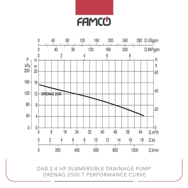 Dab 2.4 HP Submersible Drainage Pump DRENAG 2500 T Performance Data