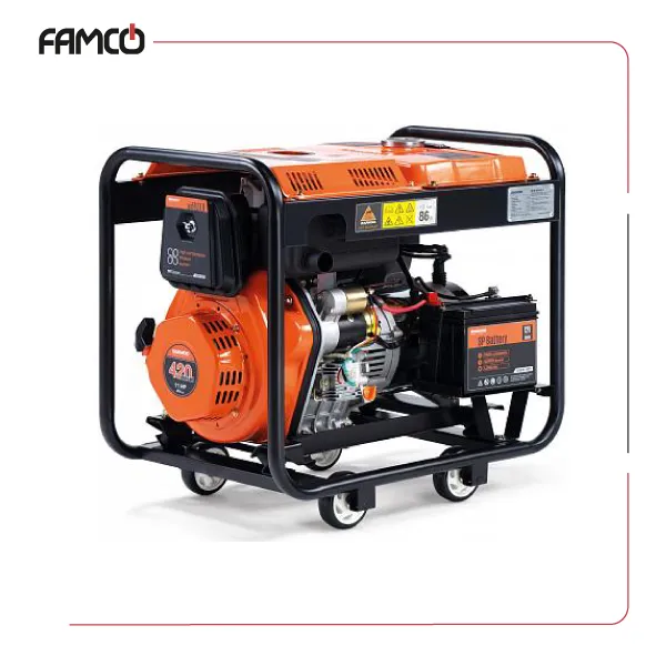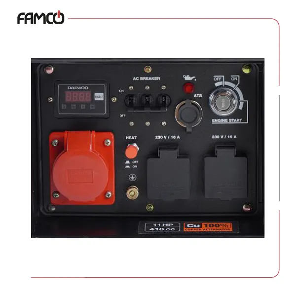It includes a 5-in-1 display for monitoring essential parameters. The generator, made portable and diesel-fueled, can run for up to 16 hours at 50% load, with a sound level of 61 dB(A). Powered by a 418 cc, 11 HP DAEWOO 420 diesel engine, this 4-stroke engine is reliable and efficient.