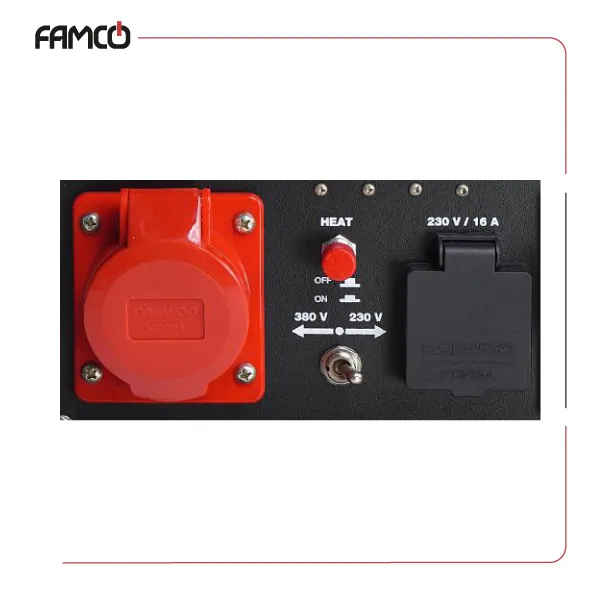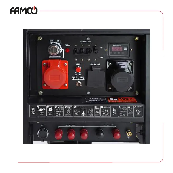 It includes two sockets: a 32A socket at 230V and a 16A socket at 380V, along with an ATS connector for automatic transfer switching. The display is a 5-in-1 type, providing this Daewoo generator with multiple functions for easy monitoring. With a runtime of 13 hours at 50% load, it is ideal for extended use. The sound power level is 69 dB(A), which is relatively quiet for a generator.