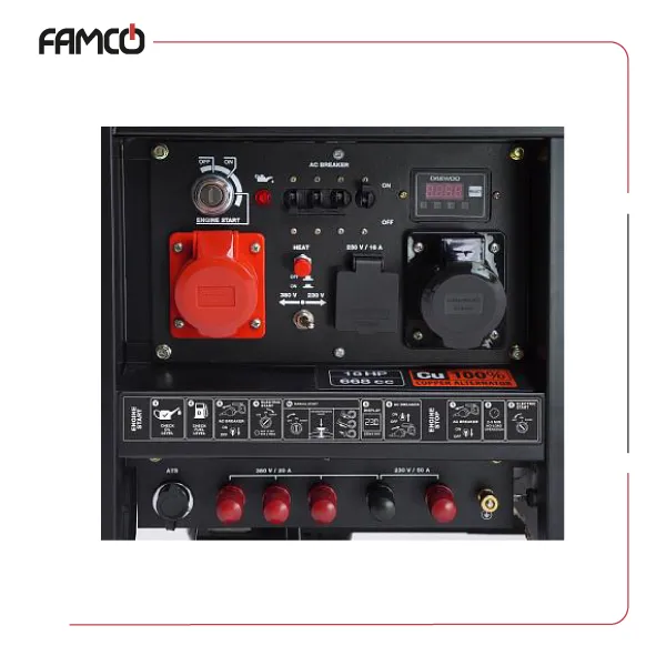 Powered by a 668 cc DAEWOO 670 diesel engine, this Daewoo generator delivers 18 HP and features a 4-stroke engine type. The fuel tank holds 13.5 liters, and the oil capacity is 2.1 liters. It has an electro-start system with a starter battery for quick ignition. The presented portable generator’s compact dimensions are 800 mm in length, 550 mm in width, and 770 mm in height, with a weight of 120 kg. So, its placement and maneuverability are non-issues.