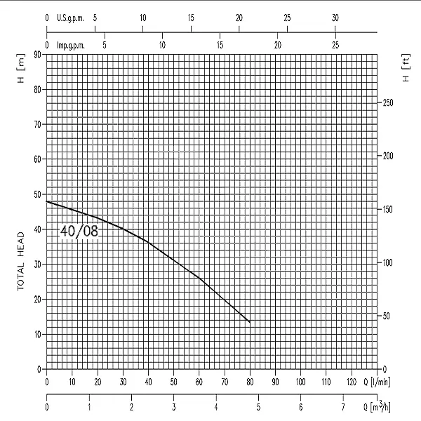 This product features a maximum temperature of +40°C and can handle solids up to 2.5 mm in size. The casing is made from EN 1.4301 (AISI 304) stainless steel, ensuring durability and resistance to corrosion. The impeller is reinforced with PPE and PS glass fiber, providing strength and efficiency. The pump’s side shaft seal consists of SiC, carbon, and NBR, while the motor side uses carbon, ceramic, and NBR for optimal sealing. It operates with white mineral oil as a lubricating liquid, specifically Esso Marcol 152 (90 cc). The product’s power output of 0.6 kW (0.8 HP) and an approximate rotation speed of 2800 rpm deliver high performance with ease. This Ebara sbmersible pump has an insulation class of F and a protection degree of IP 68, making it suitable for various environments. The voltage options include single-phase at 230V and three-phase at 230-400V. The head range is between 13.4 to 48 meters, and the dimensions are compact, measuring 30 mm in width and 513 mm in height.