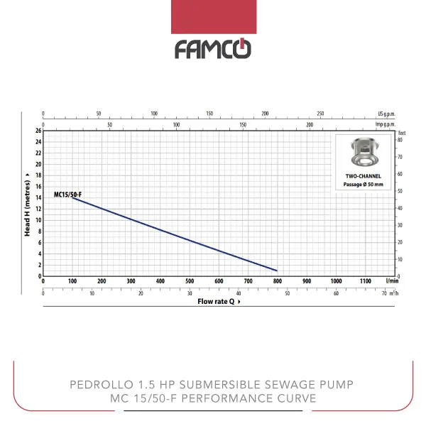 Pedrollo 1.5 HP Submersible Sewage Pump MC 15/50-F Performance Data