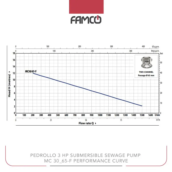 Pedrollo 3 HP Submersible Sewage Pump MC 30/65-F Performance Data