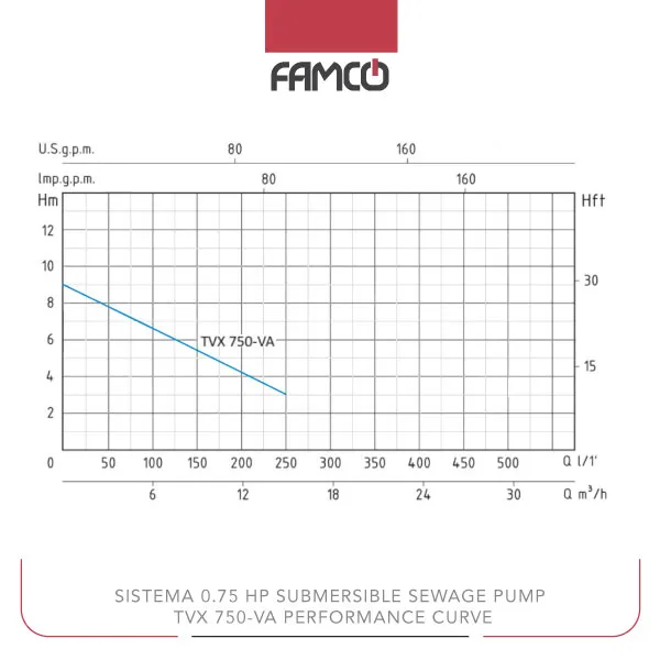 Sistema 0.75 HP Submersible Sewage Pump TVX750-VA Performance Data